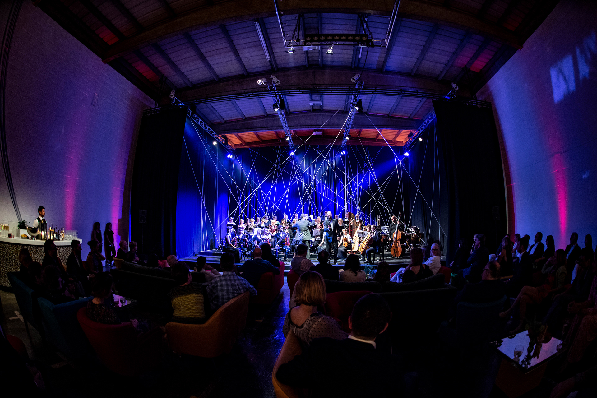 A sense of intrigue and drama was created for the orchestra stage, where string weaved between the performers to create a contemporary, 3D geometric backdrop.